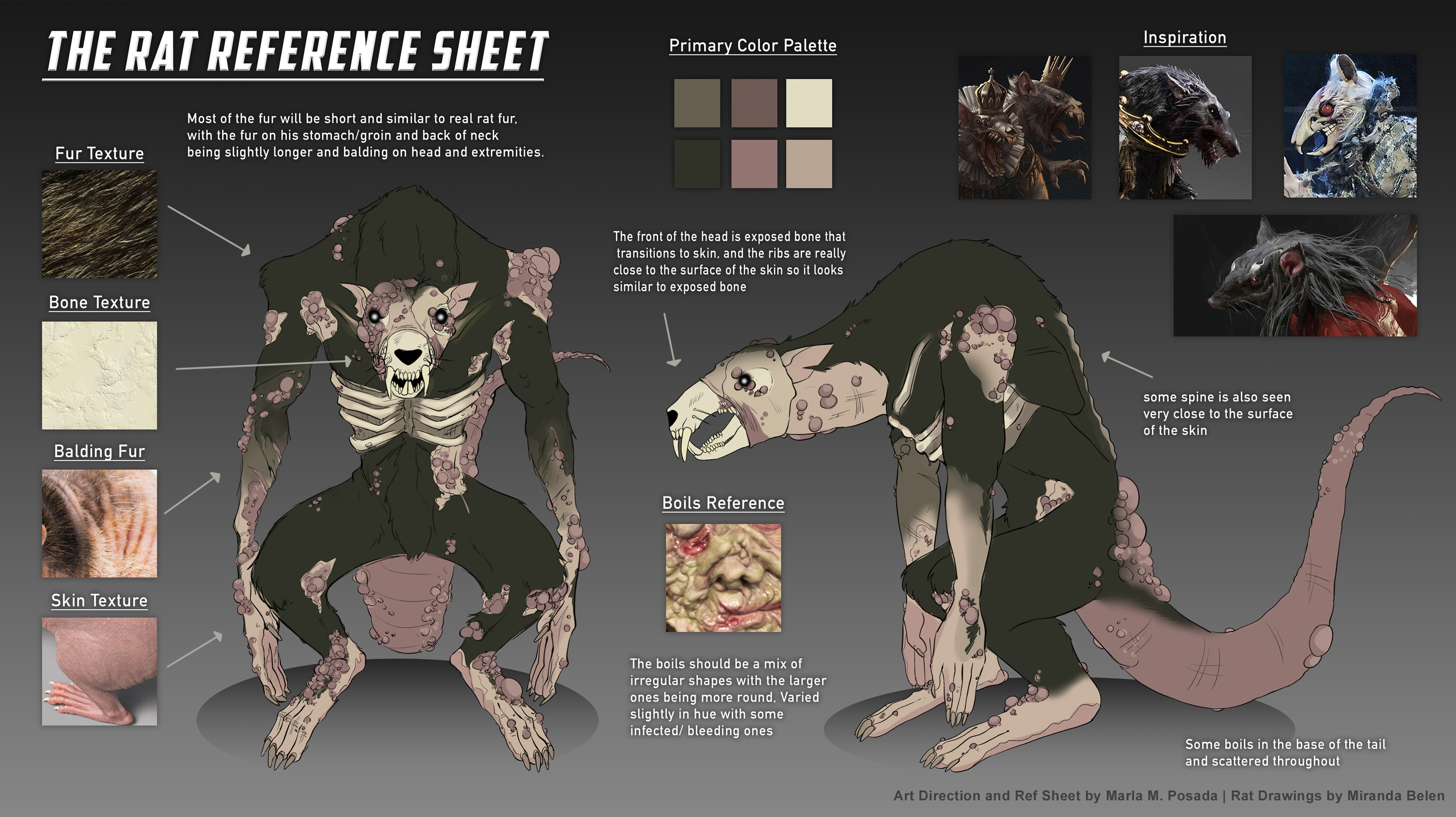 One of several reference sheets for our creature 3D modeler and costumer. Art Direction and Breakdown by me. Rat Drawings by Miranda Belen.